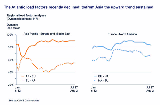 “Beneath this Global average are, however, regional differences. The load factors to and from Asia shows a different pattern than the ones across the Atlantic but this decline in load factor is mainly caused by increasing capacity. For example, Eastbound Atlantic capacity in the week of July 27- August 2 was 10% higher than in the last week of June, while the cargo volumes rose by ‘just’ 4% over that same timeframe.”