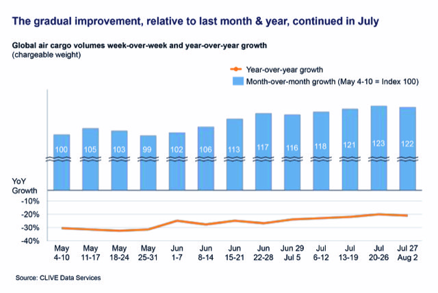 Global air cargo volumes continued to show a ‘gradual but consistent’ month-on-month recovery in July, increasing by 8% over June, according to the latest air cargo market analysis by CLIVE Data Services.